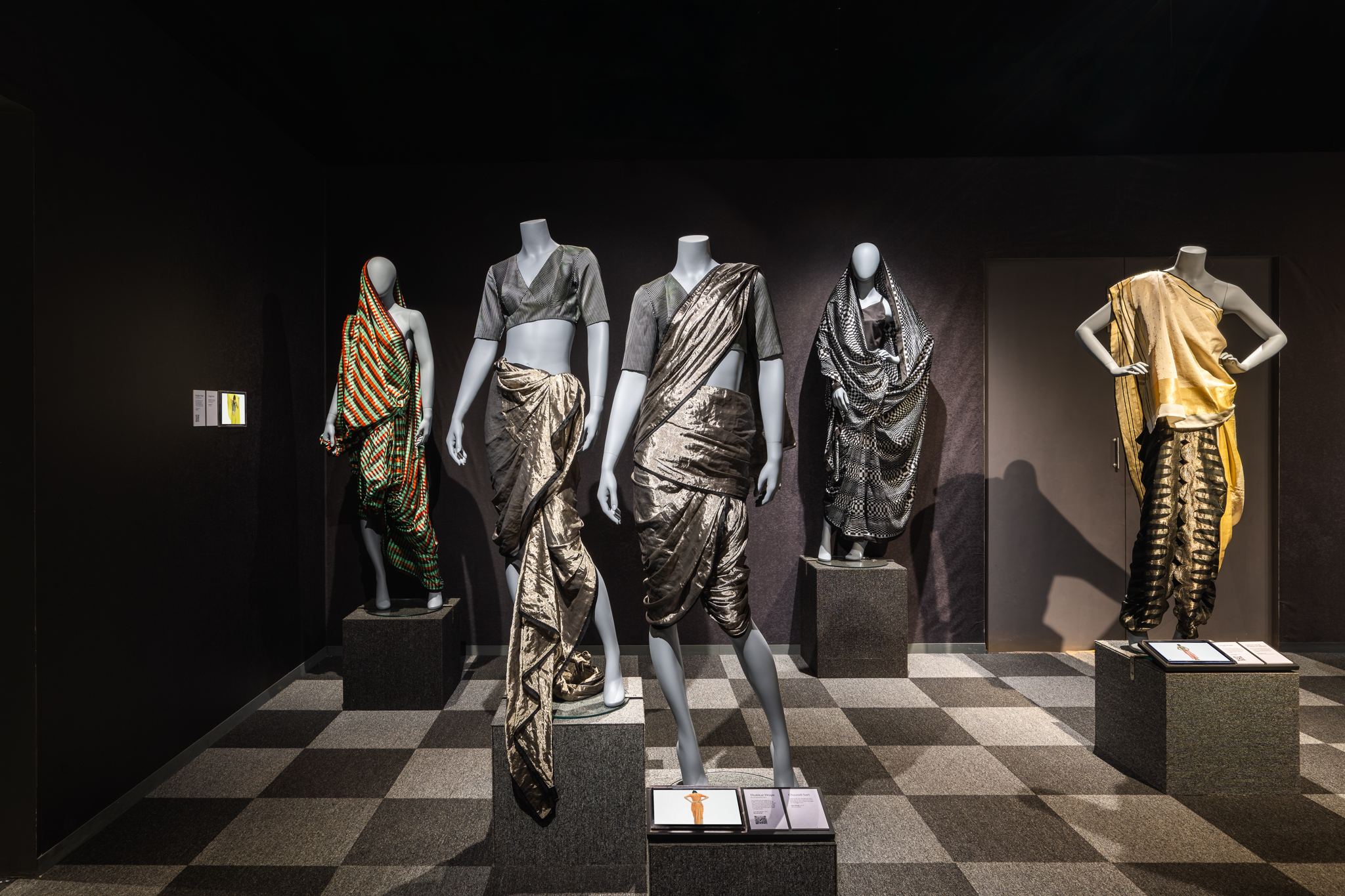 Sixteen drapes from The Sari Series, presented in Raw Mango saris, were exhibited as a living, generative craft at Infinite Drape, curated by Rashmi Varma at the Serendipity Arts Festival, 2025.